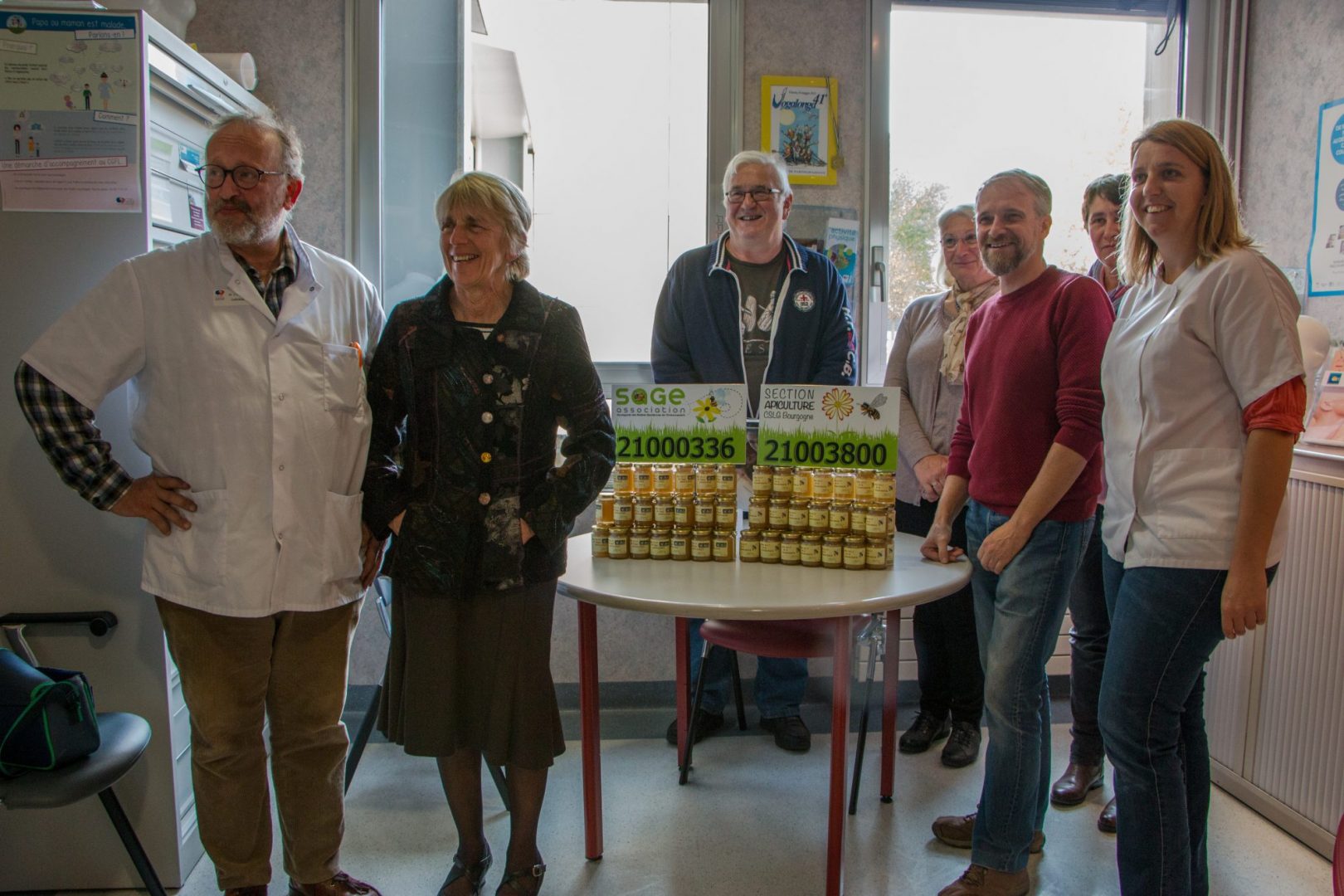 Vendredi 3 novembre, les membres de l’association SAGE ont fait don de pots de miel qui seront distribués aux patients hospitalisés au CGFL. . La récolte est issue des ruches implantées à la gendarmerie de Dijon et de celles de « Papy Jean Louis », apiculteur et membre de l’association qui a été emporté par le cancer en 2014 et qui était soigné au Centre.