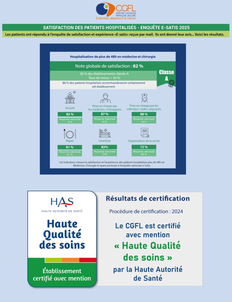 Le Centre Georges-François Leclerc figure dans le classement publié par Le Figaro Magazine, qui compare plus de 900 établissements publics et privés en France à partir des questionnaires de satisfaction recueillis par la Haute Autorité de Santé (HAS) auprès des patients hospitalisés. Ce classement met en lumière les établissements les mieux perçus par les patients pour la qualité de leur prise en charge.